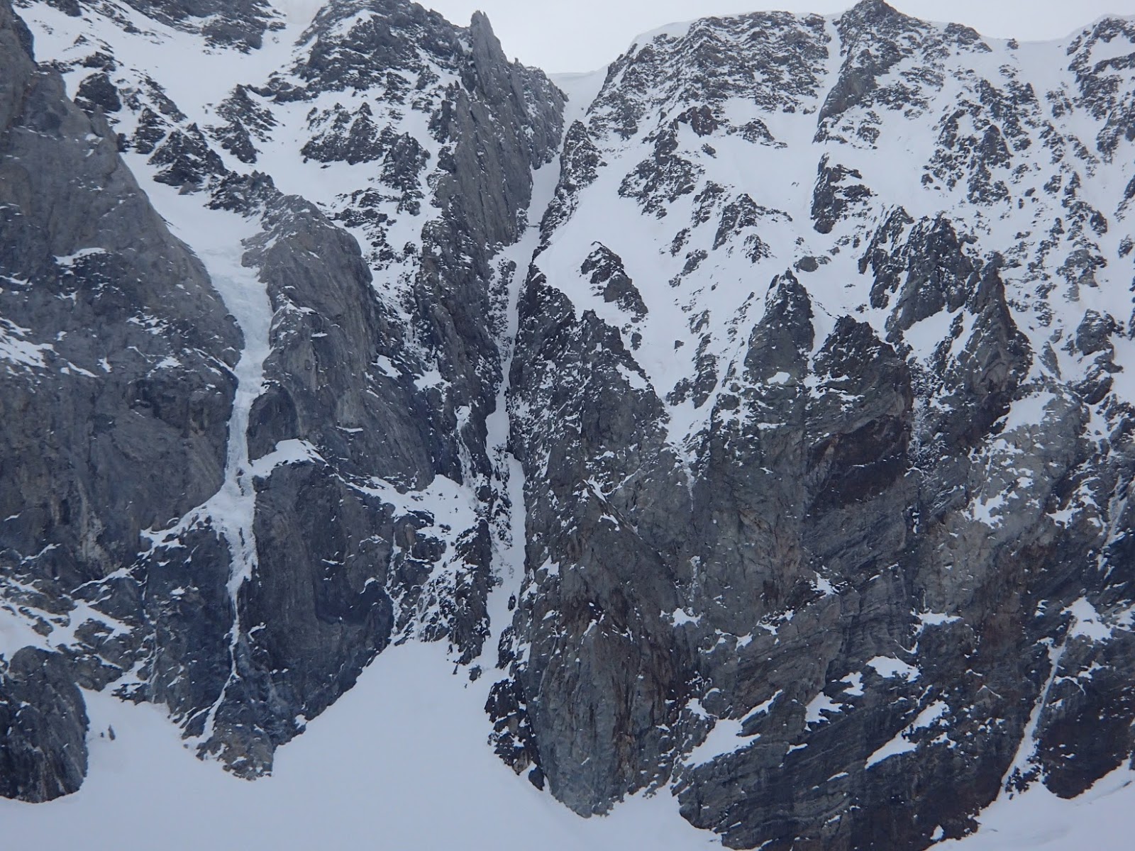 Empezamos la canal, con esa nieve blanda, pero fácil de progresar sobre ella, hasta un derecho primer resalte de mixto, más complicado de lo previsto y donde decidimos encordarnos. Después de otro tramo más amable, encaramos un corto muro de hielo que nos deposita en otro tramo de nieve blanda. A partir de este punto las dificultades decrecen y continuamos hasta la salida al collado Arlaud, por nieve blanda pero aún con una respetable inclinación.